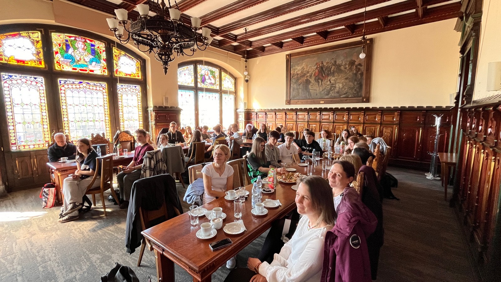 Nach dem Besuch im Landratsamt führte der Weg unsere Schülerinnen und Schüler in den eindrucksvollen Rathaussaal des im Jahr 1902 im neugotischen Stil errichteten Rathauses von Chojnice. In stilvoller Atmosphäre – bei kühlen Getränken und einem kleinen Snack – wurden sie dort vom Stadtsekretär Robert Wajlonis herzlich empfangen. Mit großer Sachkenntnis und viel Engagement vermittelte er den Gästen einen spannenden Einblick in die Geschichte und Entwicklung der Stadt – von ihren historischen Wurzeln bis zur modernen Gegenwart.