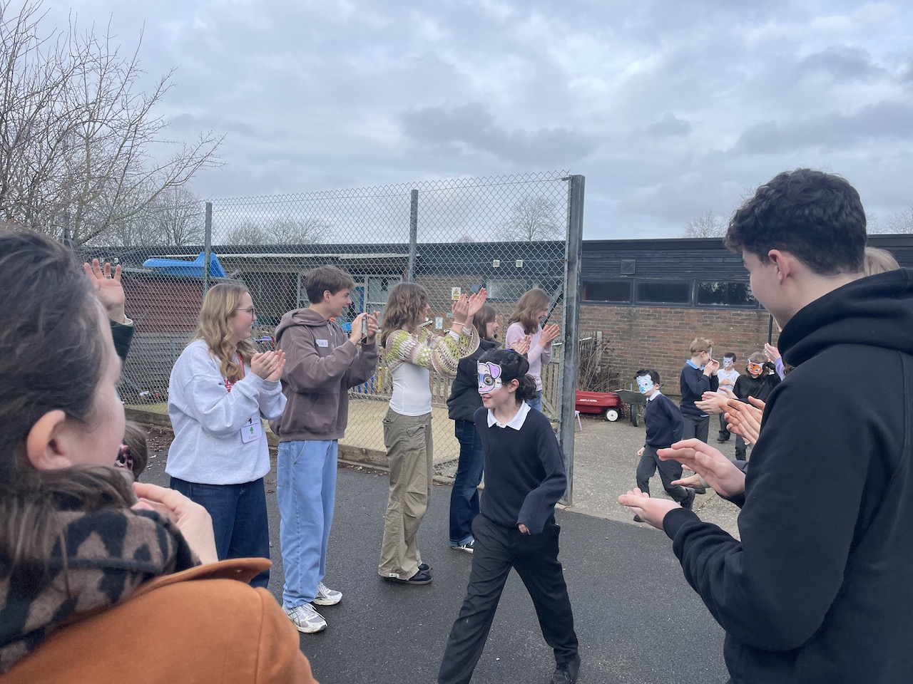 Der wohl aufregendste Tag stand dann am Mittwoch bevor: Nun sollten auch die Kinder der Stanton Primary School die Möglichkeit bekommen, einen Einblick in die deutsche Sprache und Kultur zu erhalten. „Ich bin sehr gespannt, ob ich die Kinder überhaupt verstehe, wenn sie Englisch sprechen“ – das war die größte Sorge, die bei vielen Jugendlichen bestand. Als sie dann aber in Kleingruppen erst einmal vor den 4 bis 11-jährigen Kindern standen, zeigte sich, dass sie sich unnötig Gedanken gemacht hatten – und so manch eine*r von ihnen entdeckte vielleicht sogar seine Liebe für das Grundschullehramt. So brachten sie den älteren Kindern die ersten Sätze auf Deutsch bei, so dass sie am Ende kleine Dialoge führen konnten. Darüber hinaus erzählten sie von der deutschen Tradition des Karnevals – sehr passend am Mittwoch vor Weiberfastnacht. Aus diesem Grund wurden dann auch im weiteren Verlauf Masken gebastelt, die von den deutschen Jugendlichen schon vorbereitet worden waren, so dass sie nur noch ausgemalt werden konnten. Zudem erfuhren die Kinder dann den jeweils deutschen Begriff für das von ihnen dargestellte Wesen und konnten feststellen, dass sich manche Begriffe – wie Giraffe, Elefant, Tiger, Pirat etc. – gar nicht so sehr von ihren englischen Begriffen unterscheiden. Schwieriger wurde es da schon für die Kinder, die den Vogel, den Hund oder gar den Schmetterling gewählt hatten. „Es ist toll, wie sehr sich die Jugendlichen auf ihre Lehrerrolle eingelassen haben. Ich glaube, dass sie von diesem Besuch in der Grundschule und der Vermittlung ihrer eigenen Kultur noch viel mehr mitnehmen, als wenn wir zum Beispiel eine weitere englische Stadt besucht hätten,“ zeigte sich Denise Instinsky begeistert von dem Engagement der Schüler*innen. Den Abschluss des Tages bildete dann ein Maskenumzug über den Schulhof.