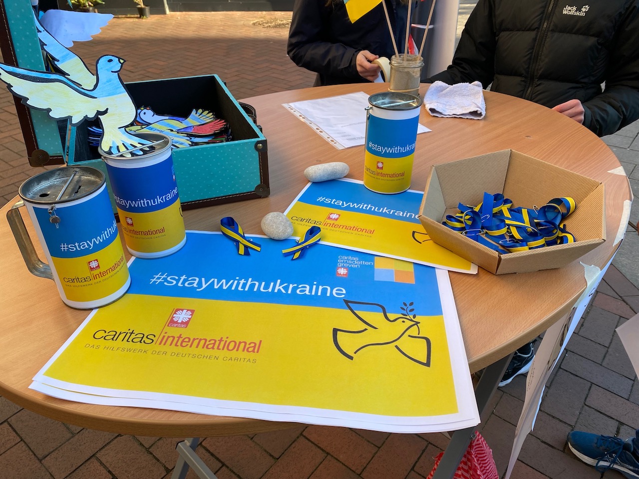In den ersten Tagen nach Ausbruch des Kriegs in der Ukraine beschlossen die Schüler*innenvertretung des Martinums, dass sie aktiv Geld für die Menschen in der Ukraine sammeln wollten. Dazu gestalteten alle Schüler*innen des Martinums Friedenstauben mit unterschiedlichem Muster, die dann Anfang März an zwei Tagen auf dem Emsdettener Wochenmarkt verkauft wurden. So konnte am Ende ein Spendenbeitrag im vierstelligen Bereich an die Caritas übergeben werden.