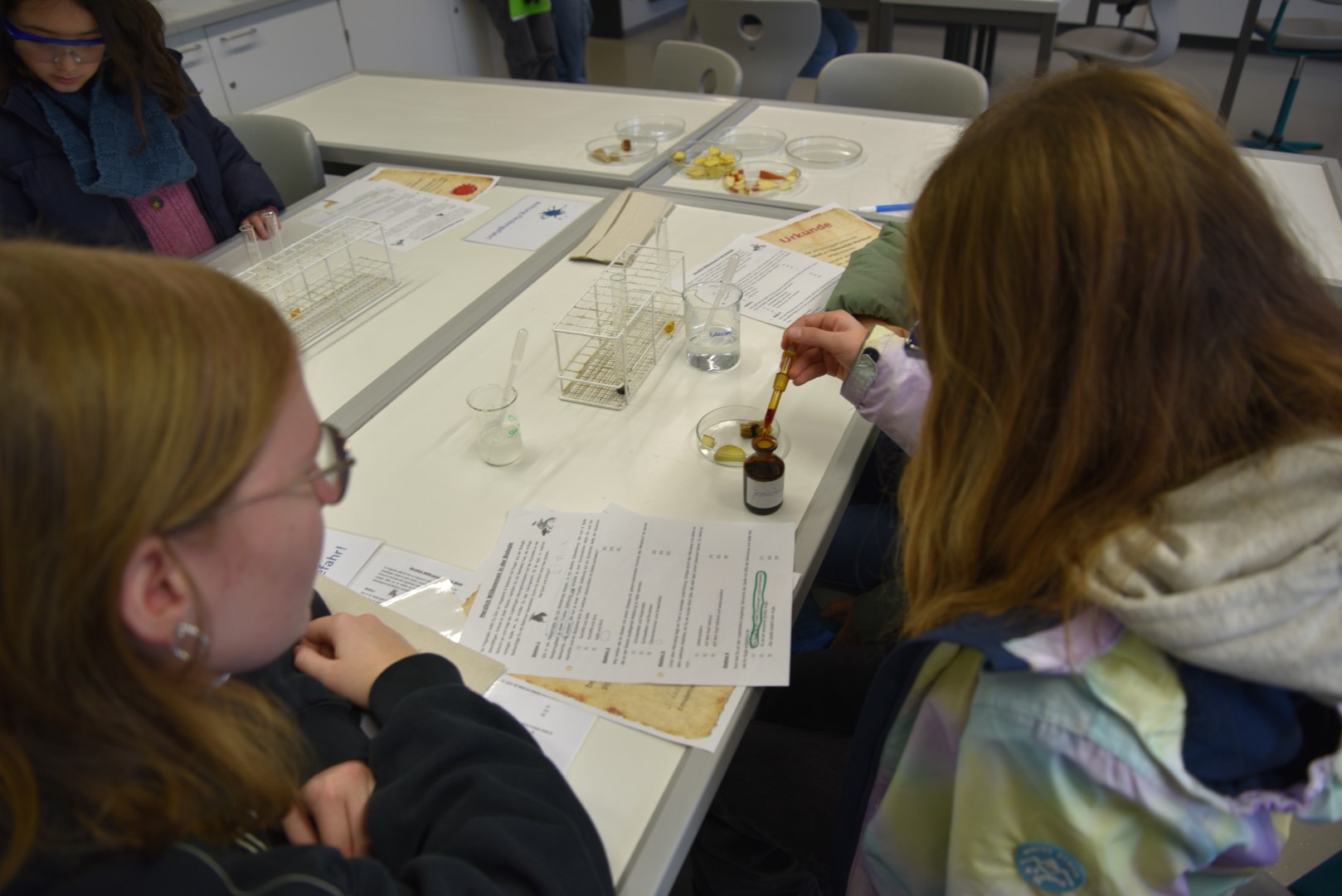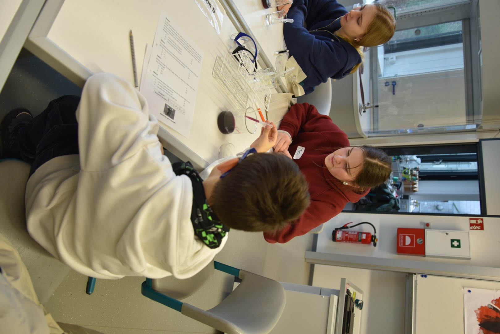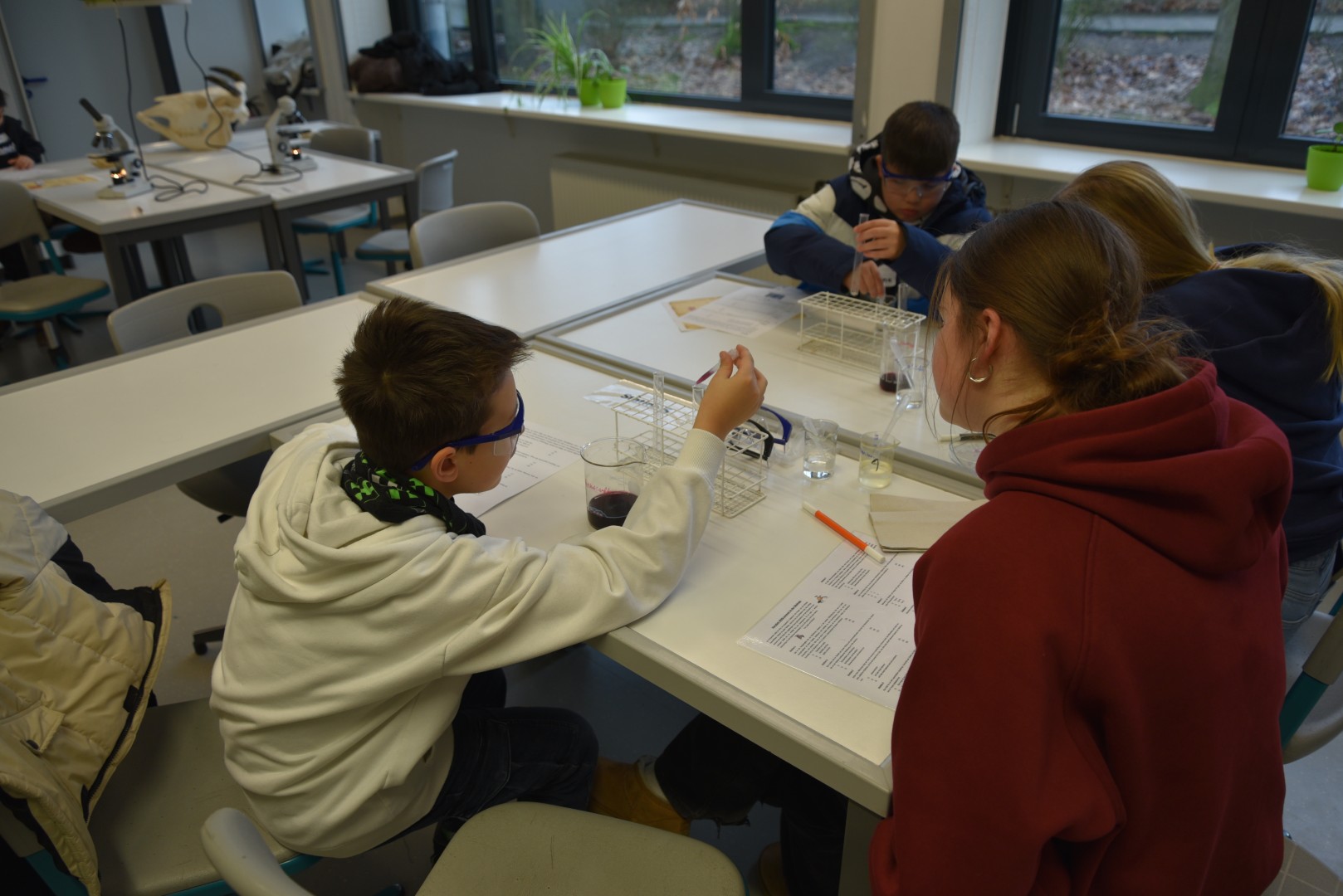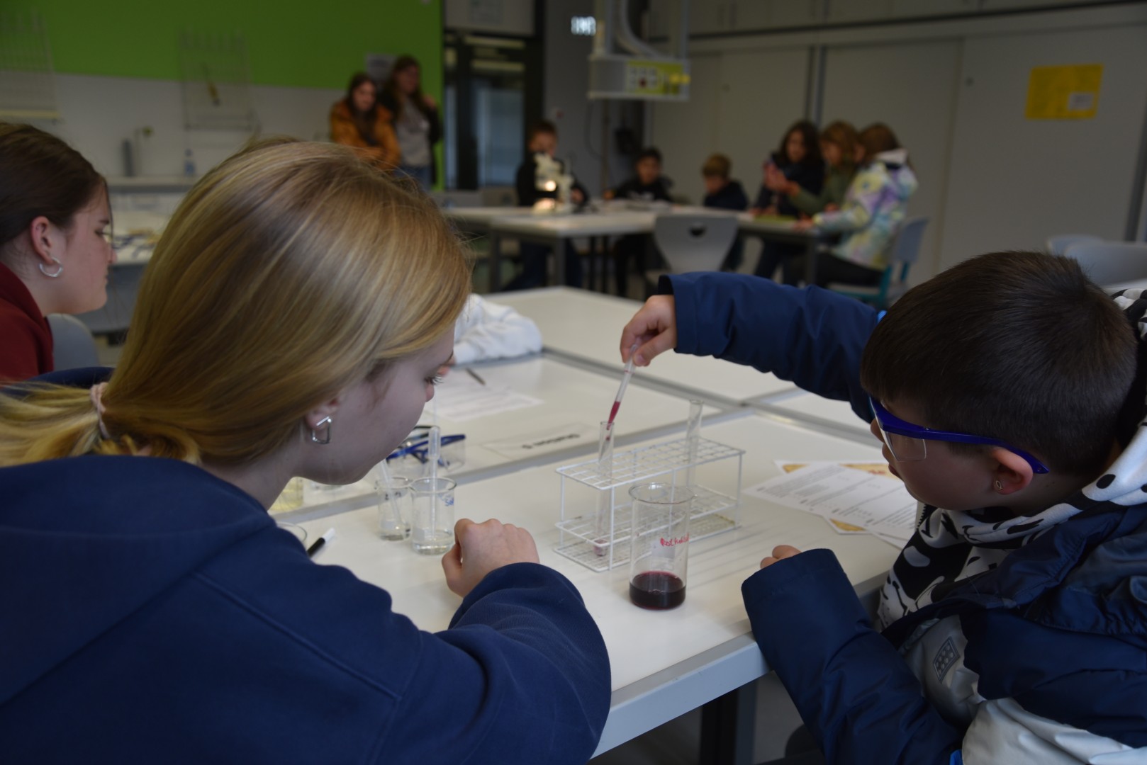 In Kleingruppen erlebten die Viertklässler/-innen nun die Vielseitigkeit des gymnasialen Fächerspektrums. Dabei konnten sie in den modernen naturwissenschaftlichen Fachräumen des Gymnasiums Experimente durchführen und die Naturwissenschaften beispielsweise beim Mikroskopieren von Tierschädeln hautnah erleben. In den Fremdsprachen wurden mit Musik und Spiel die ersten Sprachkenntnisse vermittelt oder die Zaubersprüche von Harry Potter entschlüsselt. Zauberhaft ging es auch im Mathematikunterricht beim Erlernen von Zaubertricks weiter. Die Viertklässler/-innen wurden hierbei von Schüler/-innen höherer Jahrgangsstufen begleitet, die ihnen neben den Fach- und Lernräumen auch das Schulgelände mit dem großen und vielseitigen Außengelände zeigen konnten.