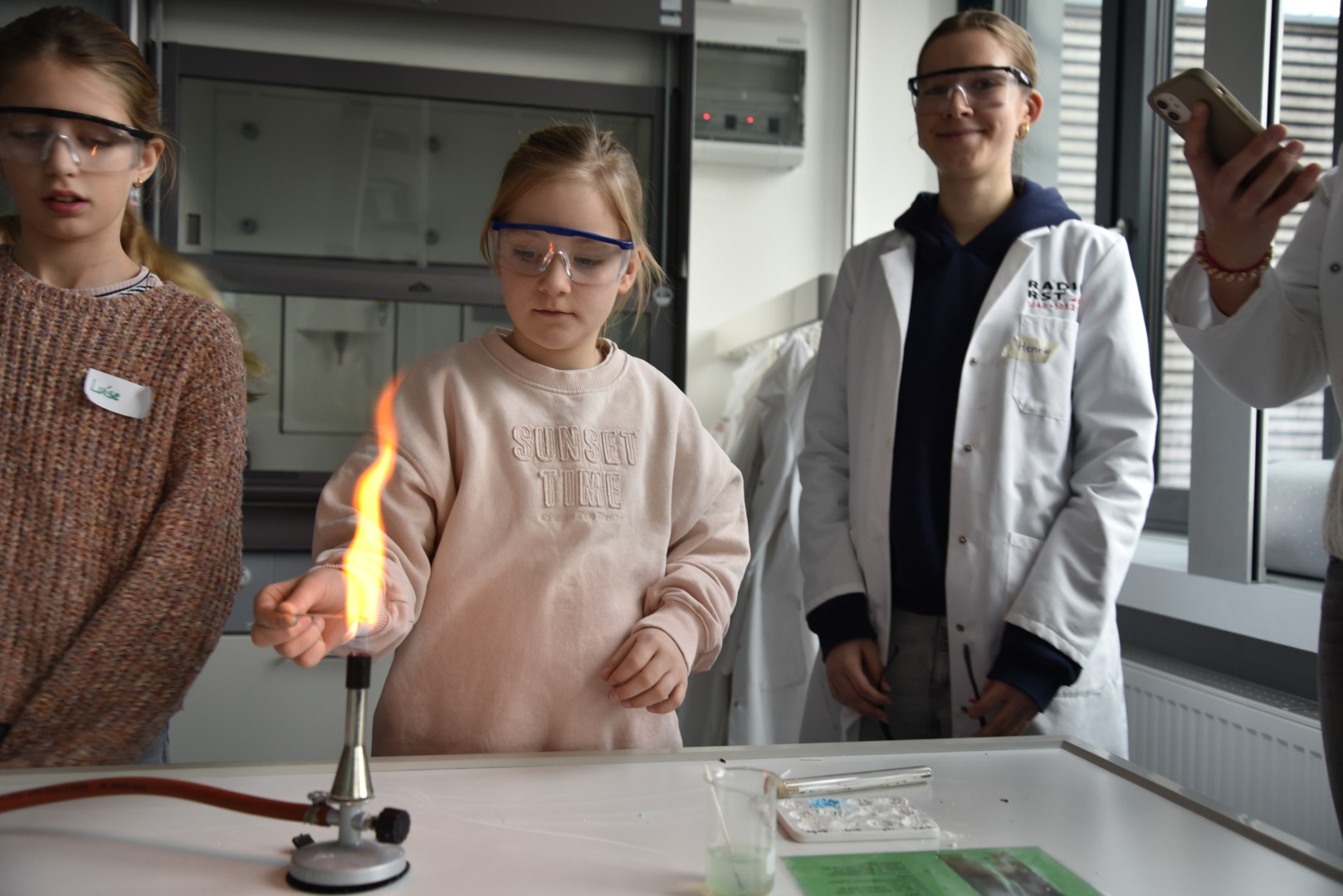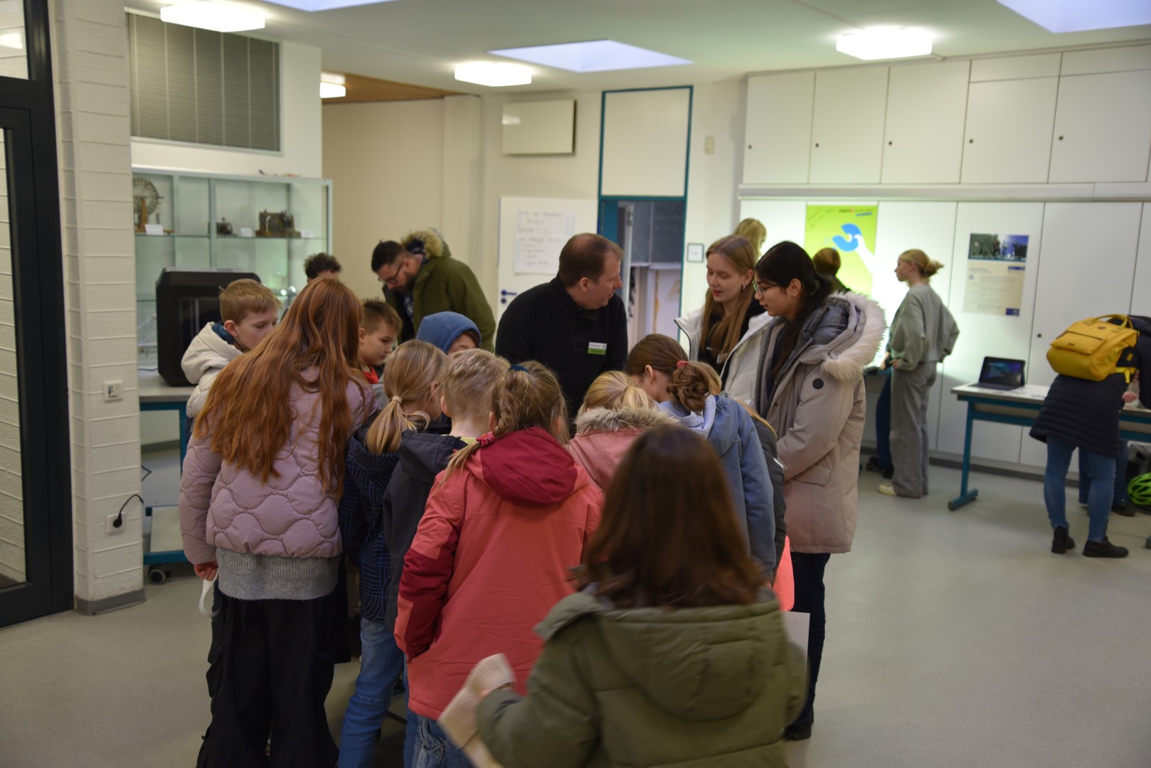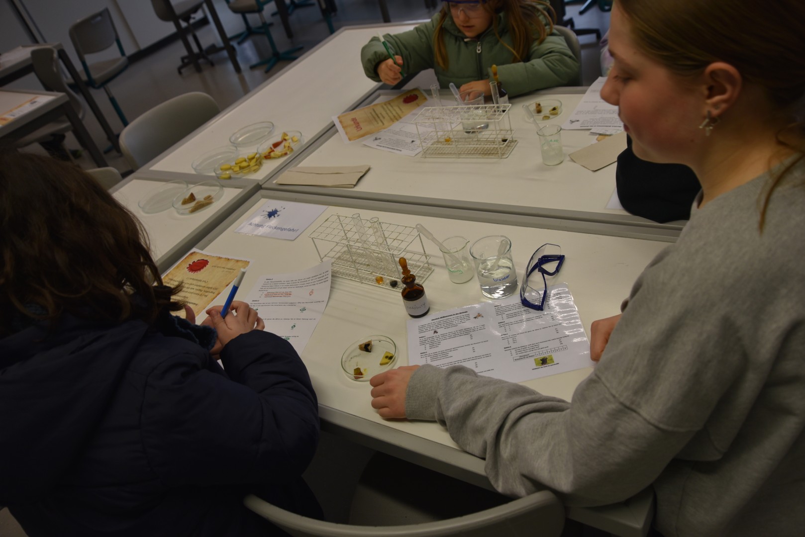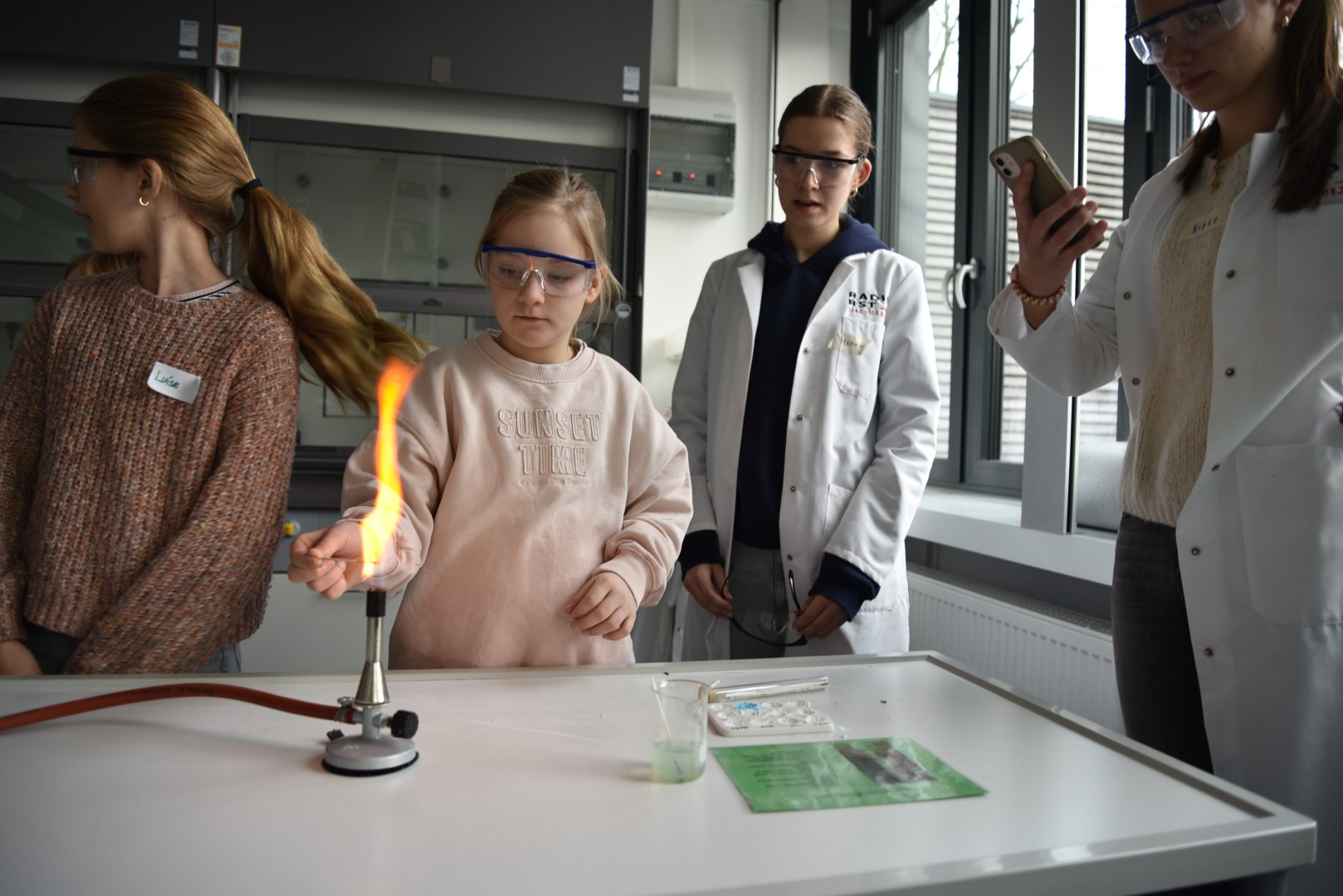 In Kleingruppen erlebten die Viertklässler/-innen nun die Vielseitigkeit des gymnasialen Fächerspektrums. Dabei konnten sie in den modernen naturwissenschaftlichen Fachräumen des Gymnasiums Experimente durchführen und die Naturwissenschaften beispielsweise beim Mikroskopieren von Tierschädeln hautnah erleben. In den Fremdsprachen wurden mit Musik und Spiel die ersten Sprachkenntnisse vermittelt oder die Zaubersprüche von Harry Potter entschlüsselt. Zauberhaft ging es auch im Mathematikunterricht beim Erlernen von Zaubertricks weiter. Die Viertklässler/-innen wurden hierbei von Schüler/-innen höherer Jahrgangsstufen begleitet, die ihnen neben den Fach- und Lernräumen auch das Schulgelände mit dem großen und vielseitigen Außengelände zeigen konnten.