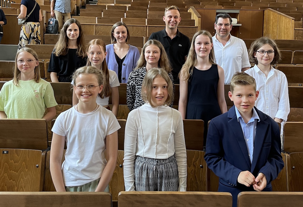 Am Samstag, den 10. Juni 2023 war es endlich so weit und unsere Schüler*innen präsentierten stolz ausgewählte Ergebnisse ihrer Arbeit im feierlichen Rahmen vor großem Publikum im Schloss der Universität Münster. Die eingeladenen Gäste zeigten sich begeistert von den souveränen Vorträgen der jungen Forscher*innen, die im Hörsaal des Schlosses schon einmal Uni-Luft schnuppern durften.