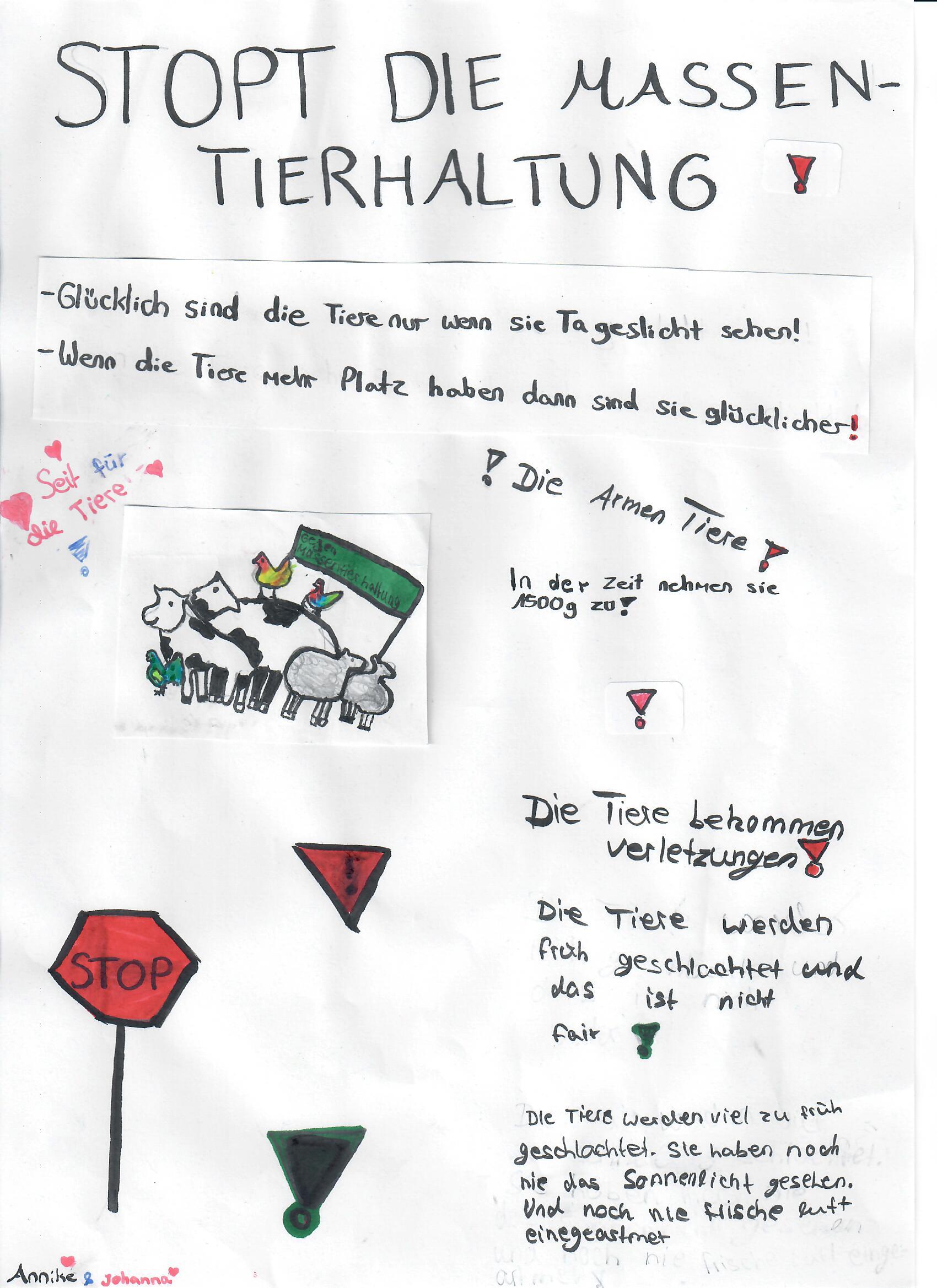 Besonders der Unterschied zwischen der konventionellen und der ökologischen Tierhaltung hat die Schülerinnen und Schüler sehr beschäftigt und sie haben viele Unterschiede zwischen diesen Haltungsformen festgestellt. Dies nahmen sie als Anlass, um auf das Tierwohl, die Nachteile in der konventionellen Tierhaltung und die Vorteile der ökologischen Tierhaltung aufmerksam zu machen.