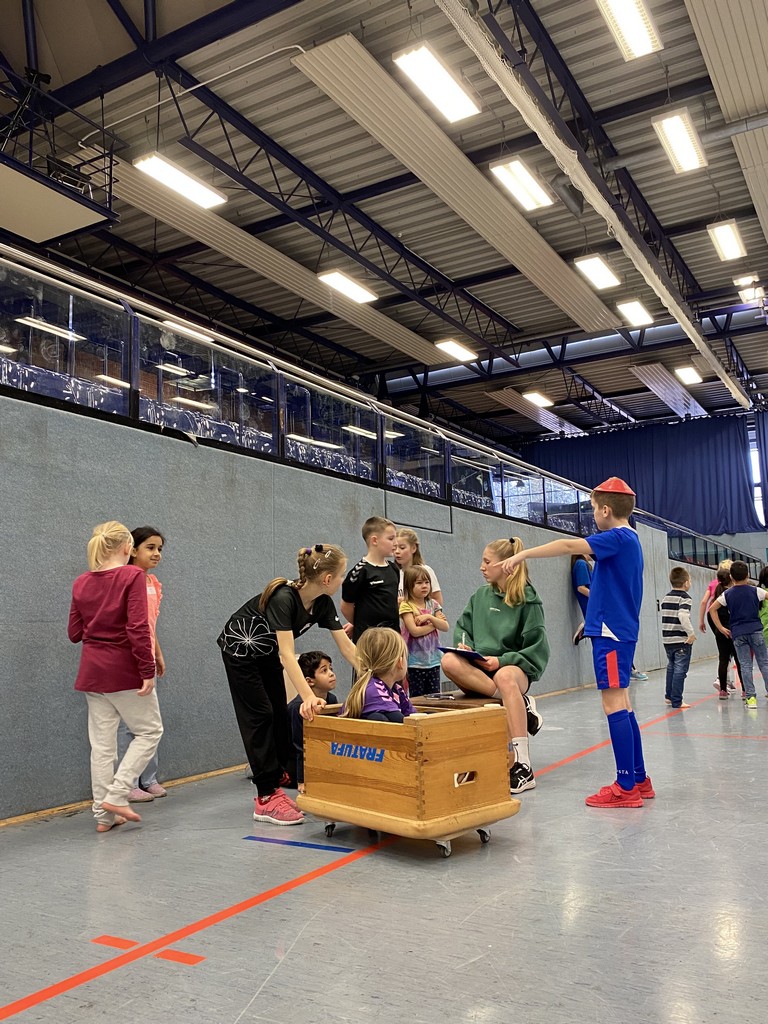 Am 25.01.2024 fand das alljährliche Hallensportfest der Kardinal von Galen Grundschule in der Emshalle statt. Herr Weidner, der momentan auch an der Grundschule tätig ist, und Frau Gerlach planten hierfür eine Kooperation, die möglicherweise der Anfang einer langfristigen Zusammenarbeit sein könnte.