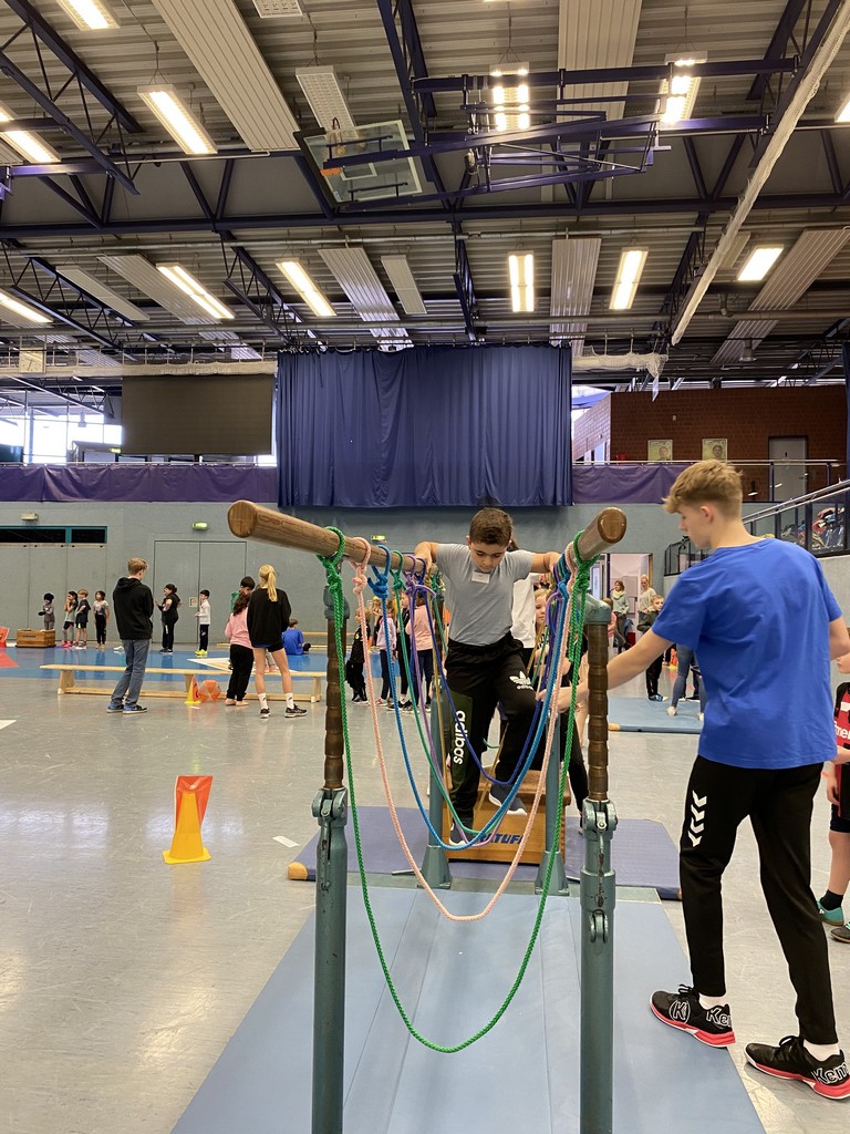 Das Kollegium der Kaddi war extrem dankbar für die großartige Hilfe der insgesamt 13 Schülerinnen und Schüler vom Gymnasium. Nicht nur der Aufbau und Abbau der 18 Stationen konnte so sehr unkompliziert und schnell geschafft werden, sondern war so auch tatkräftige Hilfe bei den Übungen und Spielen der Kinder vorhanden. Fabian Sterthaus half den Kaddi-Kids über die vorher aufgebaute Hängebrücke, Ahmad Nadji gab Tipps beim Ballpassen, Mina Lehmkuhl passte auf, dass beim Rollbrettfahren keine Unfälle passierten, Klara Wedi und Jana Hopp hatten die Zeiten an den Stationen im Blick und sorgten für die musikalische Unterhaltung. Auch alle anderen Helfer:innen (siehe Bild) leisteten mehr als vier Stunden tolle Arbeit. Die Kinder der Grundschule hatten viel Freude und waren sehr glücklich, dass „die Großen“ da waren und ihnen so gerne geholfen haben.