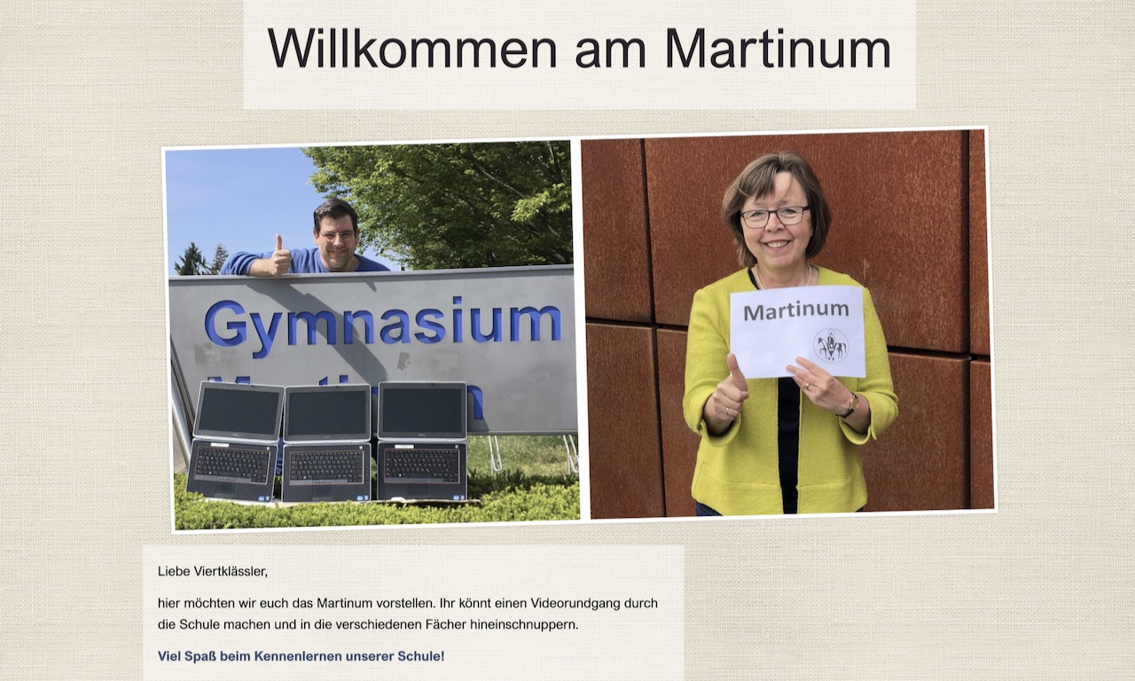 Wir haben zwei verschiedene Websites - eine für Schüler*innen und eine für Eltern - zusammengestellt, um Ihnen und Ihren Kindern einen Einblick in das Leben und Lernen am Martinum zu ermöglichen.