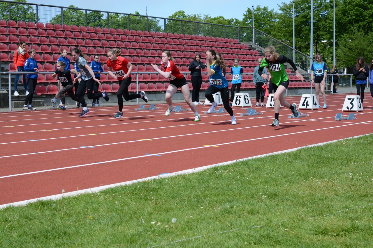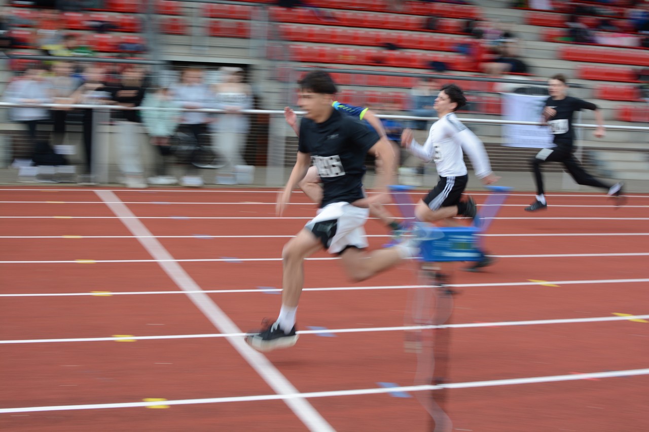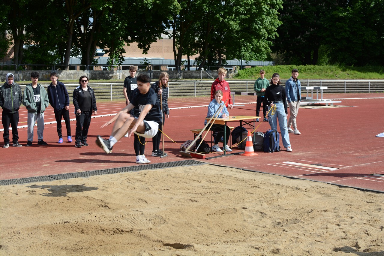 Bereits früh morgens versammelten sich alle SportlerInnen der Jahrgänge 2008-2011 an der Schule,um später mit dem Bus zum Jahn-Stadion zu fahren.Hier machten sich dann alle gemeinsam warm und starteten ein wenig später in ihre Disziplinen, also zum Beispiel Kugelstoßen, Hochsprung, Sprint und vieles mehr. Jede/r SchülerIn wurde tatkräftig unterstützt und alle fieberten mit, wodurch eine grandiose Stimmung entstand.
