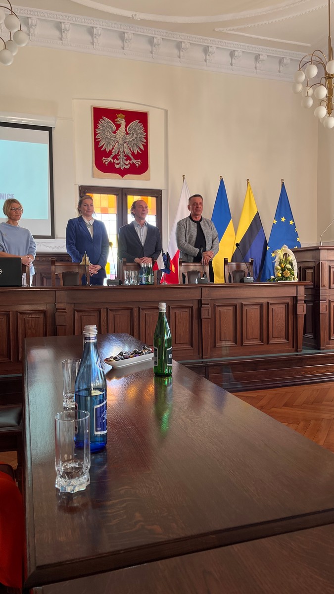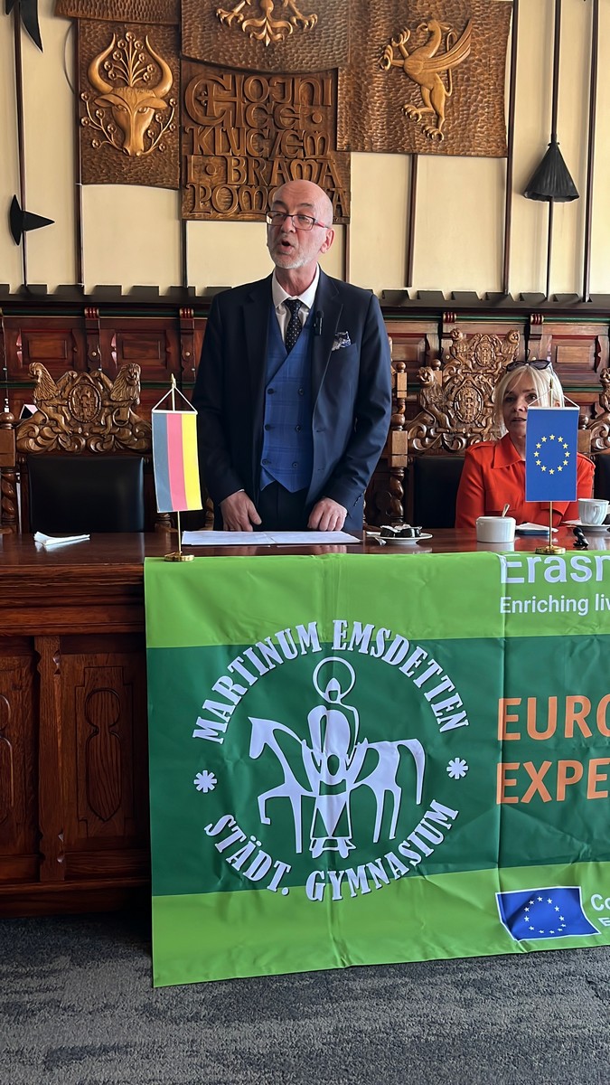 Nach dem Besuch im Landratsamt führte der Weg unsere Schülerinnen und Schüler in den eindrucksvollen Rathaussaal des im Jahr 1902 im neugotischen Stil errichteten Rathauses von Chojnice. In stilvoller Atmosphäre – bei kühlen Getränken und einem kleinen Snack – wurden sie dort vom Stadtsekretär Robert Wajlonis herzlich empfangen. Mit großer Sachkenntnis und viel Engagement vermittelte er den Gästen einen spannenden Einblick in die Geschichte und Entwicklung der Stadt – von ihren historischen Wurzeln bis zur modernen Gegenwart.