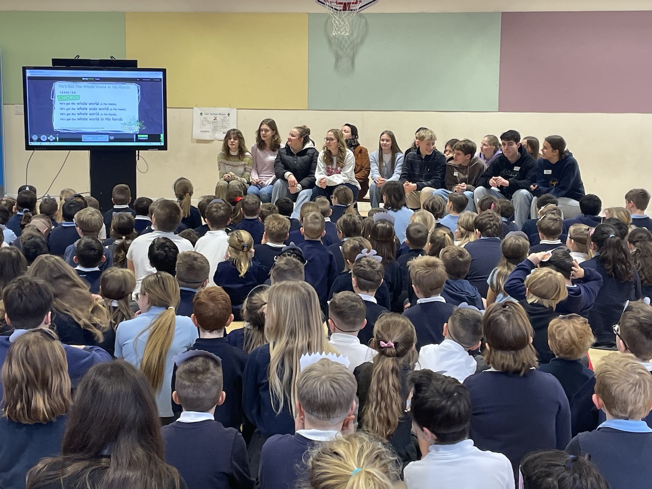 Der wohl aufregendste Tag stand dann am Mittwoch bevor: Nun sollten auch die Kinder der Stanton Primary School die Möglichkeit bekommen, einen Einblick in die deutsche Sprache und Kultur zu erhalten. „Ich bin sehr gespannt, ob ich die Kinder überhaupt verstehe, wenn sie Englisch sprechen“ – das war die größte Sorge, die bei vielen Jugendlichen bestand. Als sie dann aber in Kleingruppen erst einmal vor den 4 bis 11-jährigen Kindern standen, zeigte sich, dass sie sich unnötig Gedanken gemacht hatten – und so manch eine*r von ihnen entdeckte vielleicht sogar seine Liebe für das Grundschullehramt. So brachten sie den älteren Kindern die ersten Sätze auf Deutsch bei, so dass sie am Ende kleine Dialoge führen konnten. Darüber hinaus erzählten sie von der deutschen Tradition des Karnevals – sehr passend am Mittwoch vor Weiberfastnacht. Aus diesem Grund wurden dann auch im weiteren Verlauf Masken gebastelt, die von den deutschen Jugendlichen schon vorbereitet worden waren, so dass sie nur noch ausgemalt werden konnten. Zudem erfuhren die Kinder dann den jeweils deutschen Begriff für das von ihnen dargestellte Wesen und konnten feststellen, dass sich manche Begriffe – wie Giraffe, Elefant, Tiger, Pirat etc. – gar nicht so sehr von ihren englischen Begriffen unterscheiden. Schwieriger wurde es da schon für die Kinder, die den Vogel, den Hund oder gar den Schmetterling gewählt hatten. „Es ist toll, wie sehr sich die Jugendlichen auf ihre Lehrerrolle eingelassen haben. Ich glaube, dass sie von diesem Besuch in der Grundschule und der Vermittlung ihrer eigenen Kultur noch viel mehr mitnehmen, als wenn wir zum Beispiel eine weitere englische Stadt besucht hätten,“ zeigte sich Denise Instinsky begeistert von dem Engagement der Schüler*innen. Den Abschluss des Tages bildete dann ein Maskenumzug über den Schulhof.