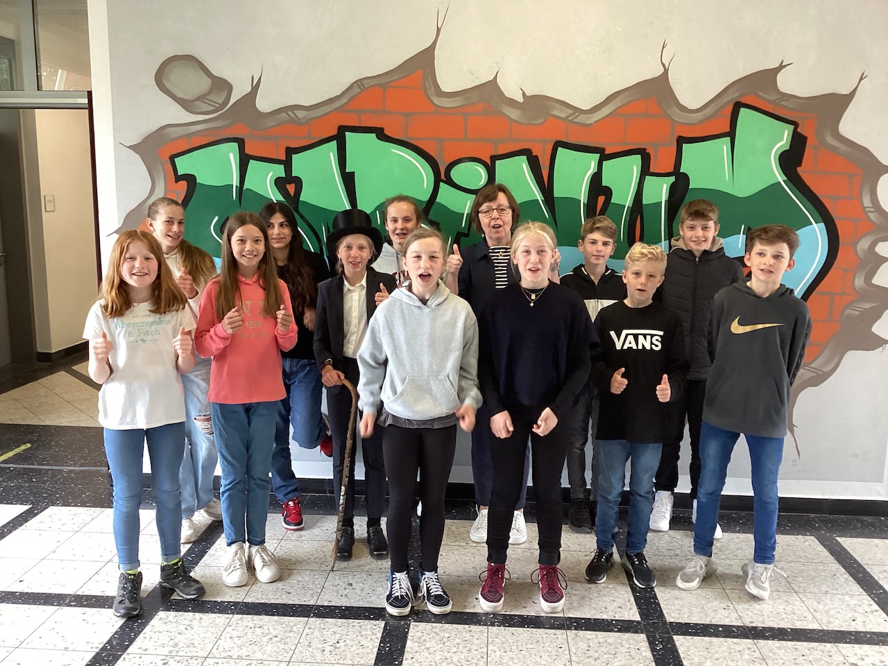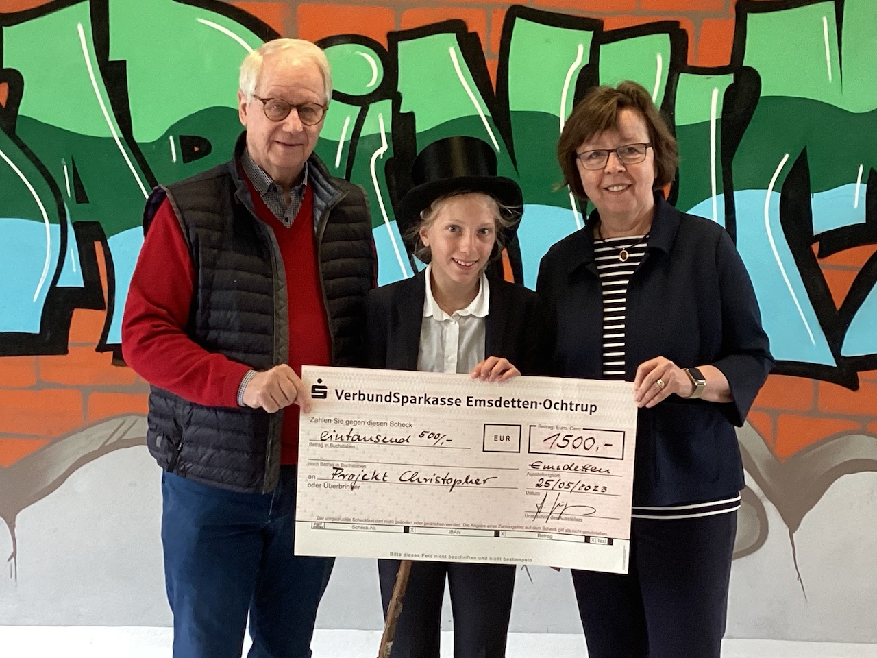 Vor dem neuen Graffiti aus dem Verantwortungskurs "Schule gestalten" fand eine ganz besondere Scheck-Übergabe am Gymnasium Martinum statt: Die Schülerinnen und Schüler der Jg. 5 haben im Rahmen des Martinsfestes kreativ gebastelt und die Eltern haben mit zahlreichen Kuchen- und Kaffeespenden geholfen, dass sehr viel Geld für das Projekt Christopher in Tansania zusammengekommen ist. Aufgestockt wurde der ansehnliche Geldbetrag durch sämtliche Einnahmen der Cafeteria beim diesjährigen Musical "Eine Woche voller Samstage", welches von den Stufen 5-7 aufgeführt wurde.