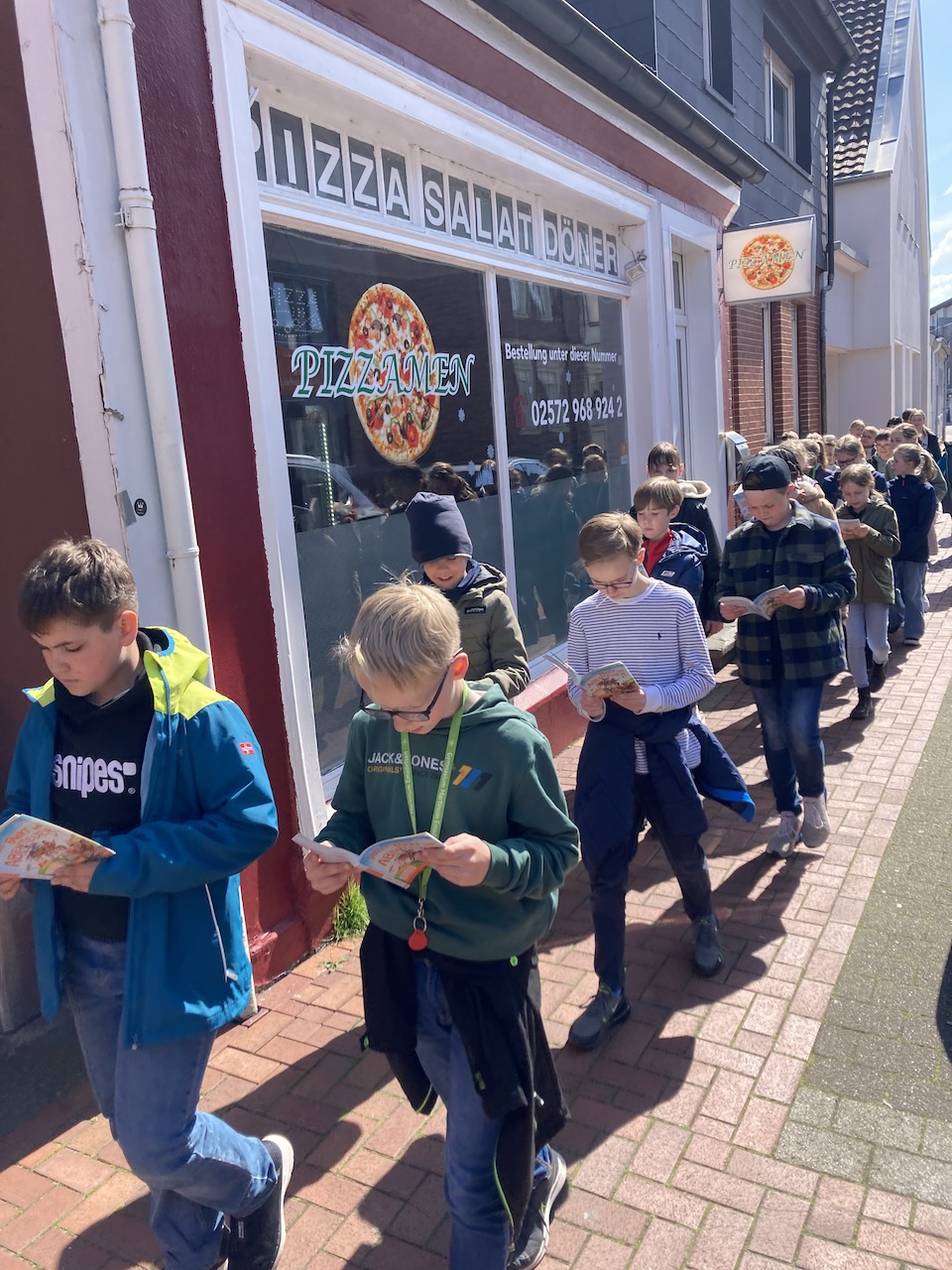 Demnach machte sich die Klasse 5d am Donnerstag, 27. April 2023, auf den Weg zur Buchhandlung „Buch & Kunst“. Vor Ort nahm sich die Buchhändlerin Bettina Schwarte viel Zeit für die Klasse. Die Schülerinnen und Schüler lernten die unterschiedlichen Bereiche in der Buchhandlung kennen. Zudem gab Frau Schwarte auch einen umfangreichen Einblick in die Welt des Buchhandels und in das Arbeitsfeld des Buchhändlers. So erklärte sie den Weg von der Bestellung eines Buches bis zur Abholung. Dabei wurde auch deutlich, wofür die ISBN-Nummer so wichtig ist. Gespannt betrachtete die Lerngruppe ein von Frau Schwarte präsentiertes früheres Nachschlagewerk, welches vor der Digitalisierung zur Bestellung eines Buches herangezogen werden musste. Mit vielen Anekdoten über ihre persönliche Bücherbeziehung kam die Buchhändlerin in den Austausch über die Leseerfahrungen der Schülerinnen und Schüler. Mit dem Buchgeschenk zum Abschluss wurde dabei nicht nur die Neugier auf ein neues Lesevergnügen, sondern auch die allgemeine Begeisterung für das Lesen geweckt.