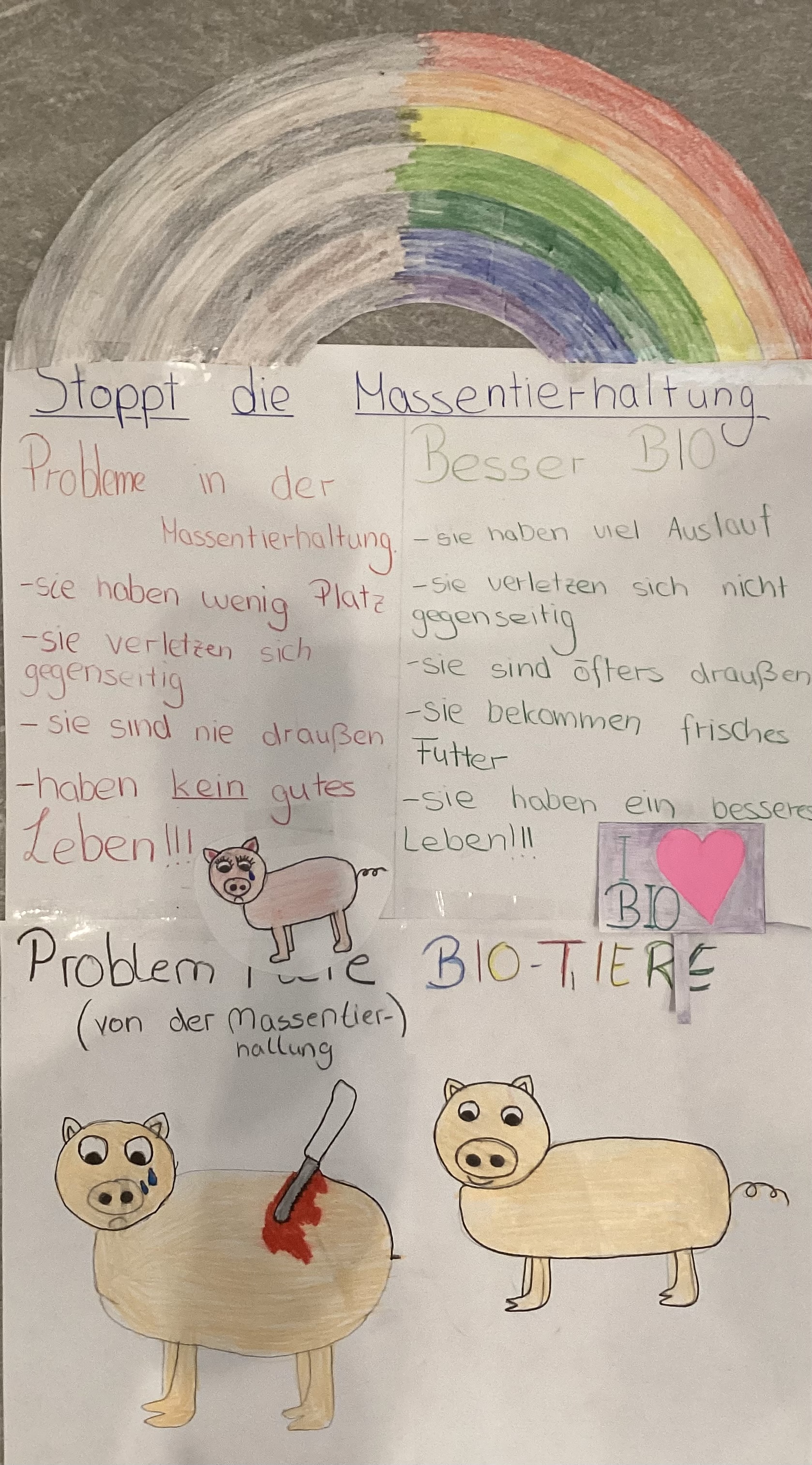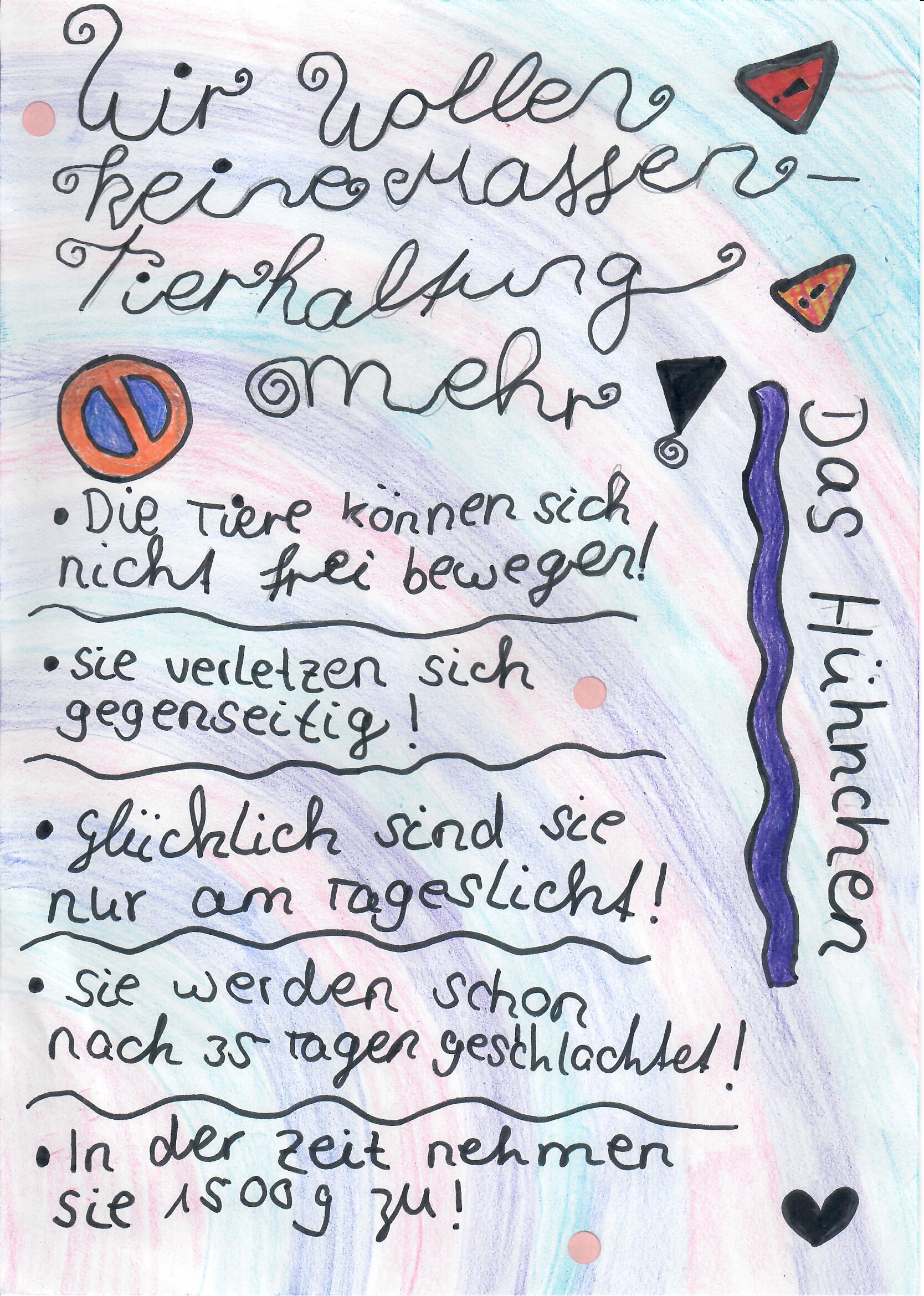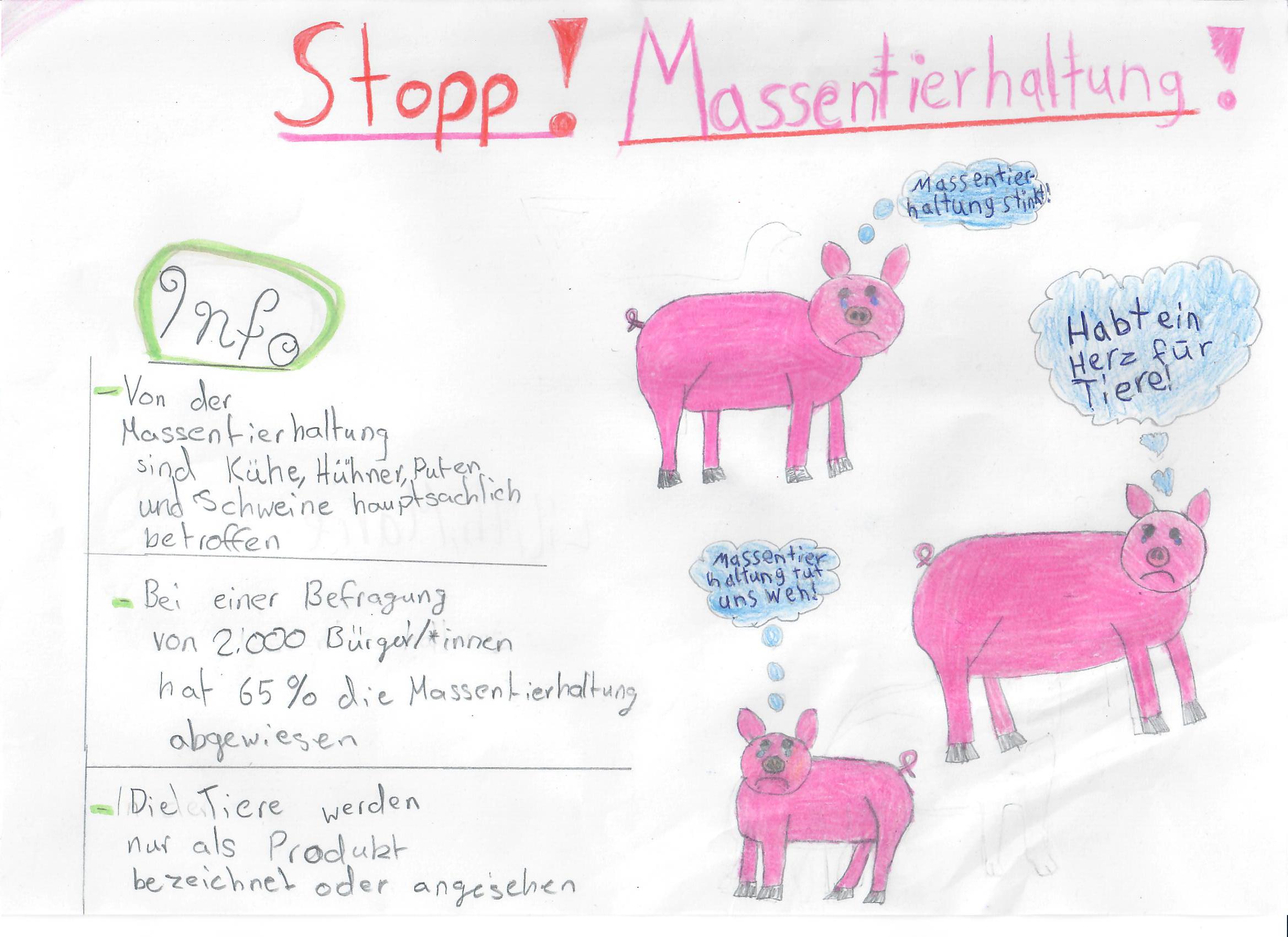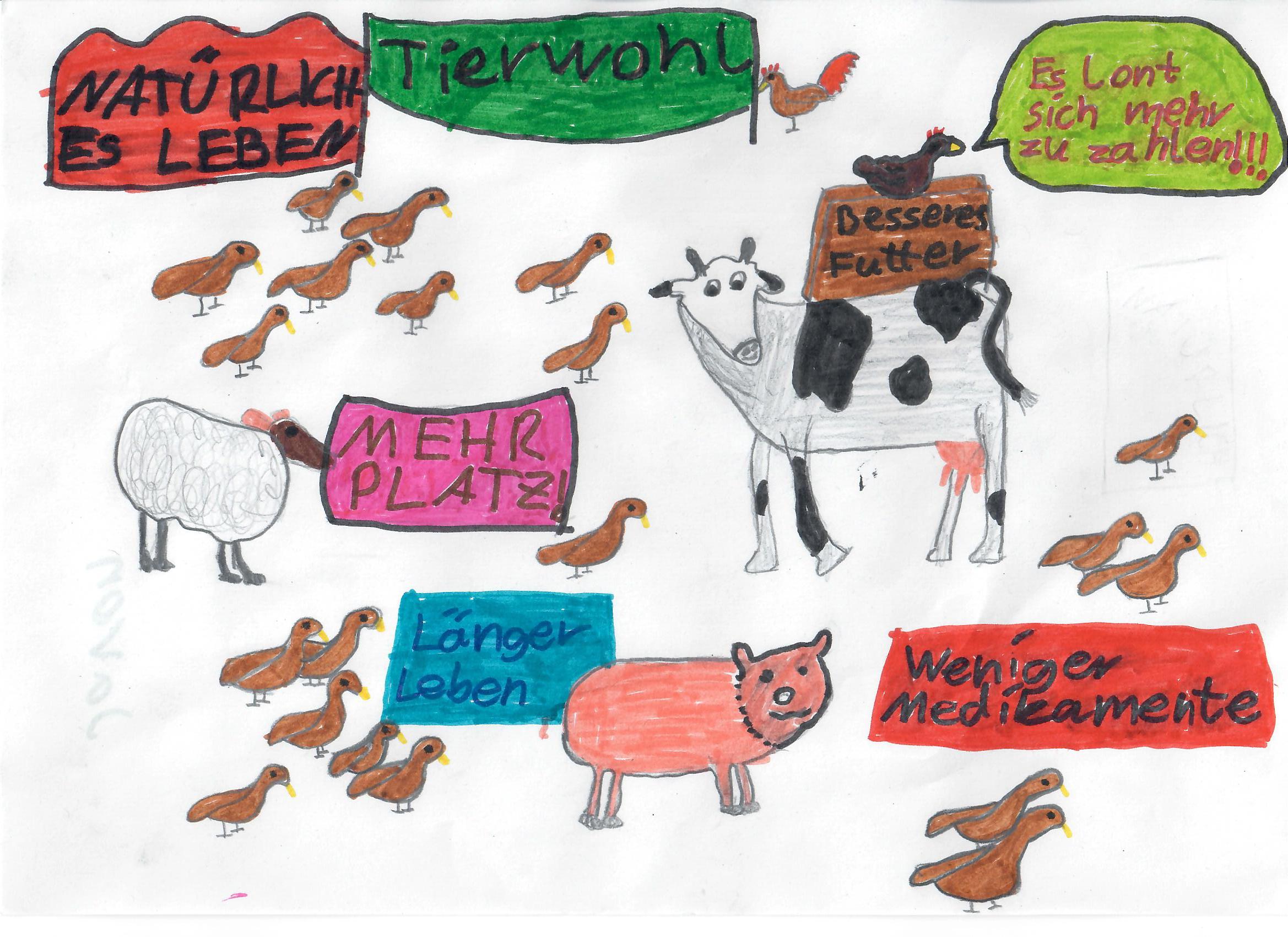 Besonders der Unterschied zwischen der konventionellen und der ökologischen Tierhaltung hat die Schülerinnen und Schüler sehr beschäftigt und sie haben viele Unterschiede zwischen diesen Haltungsformen festgestellt. Dies nahmen sie als Anlass, um auf das Tierwohl, die Nachteile in der konventionellen Tierhaltung und die Vorteile der ökologischen Tierhaltung aufmerksam zu machen.