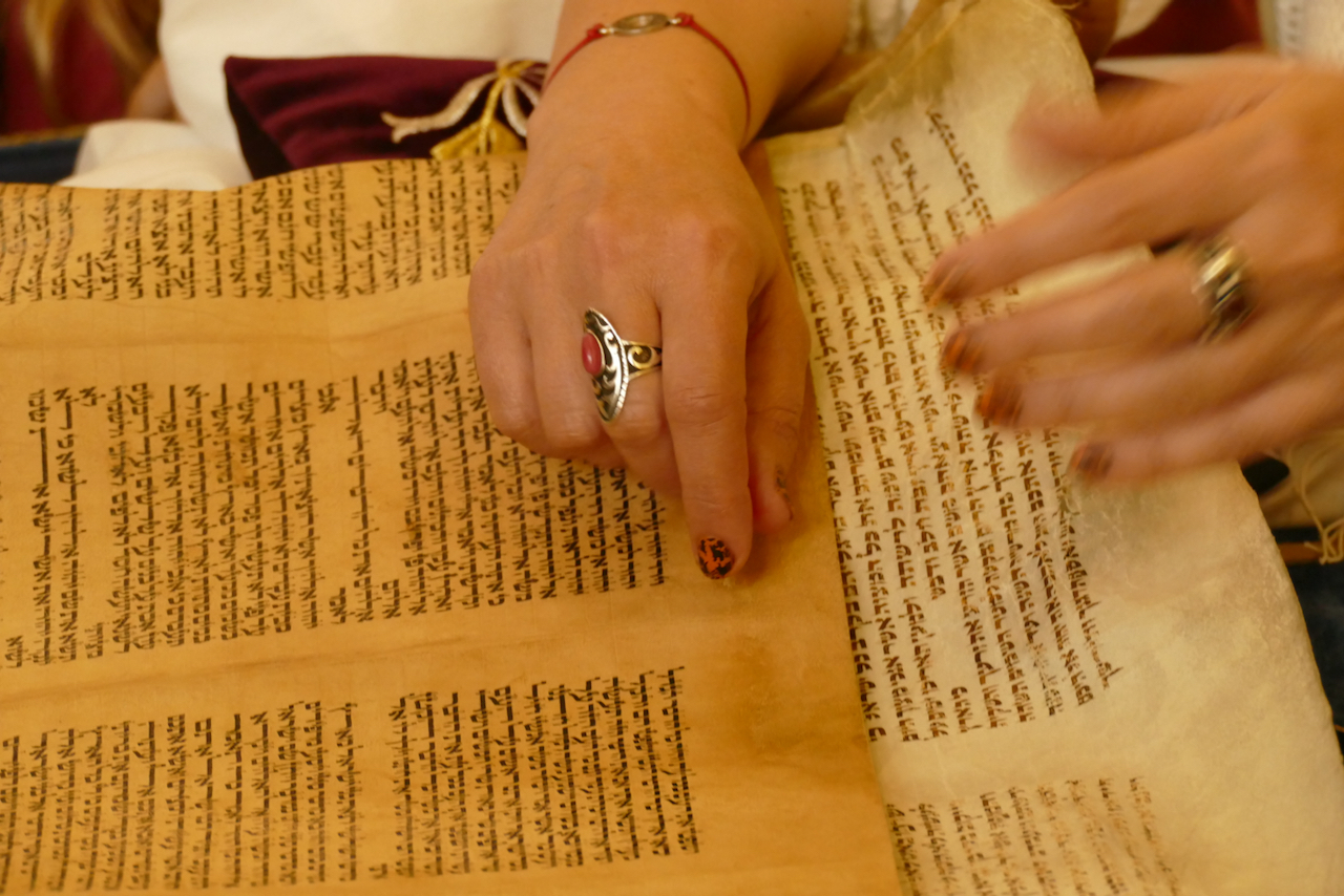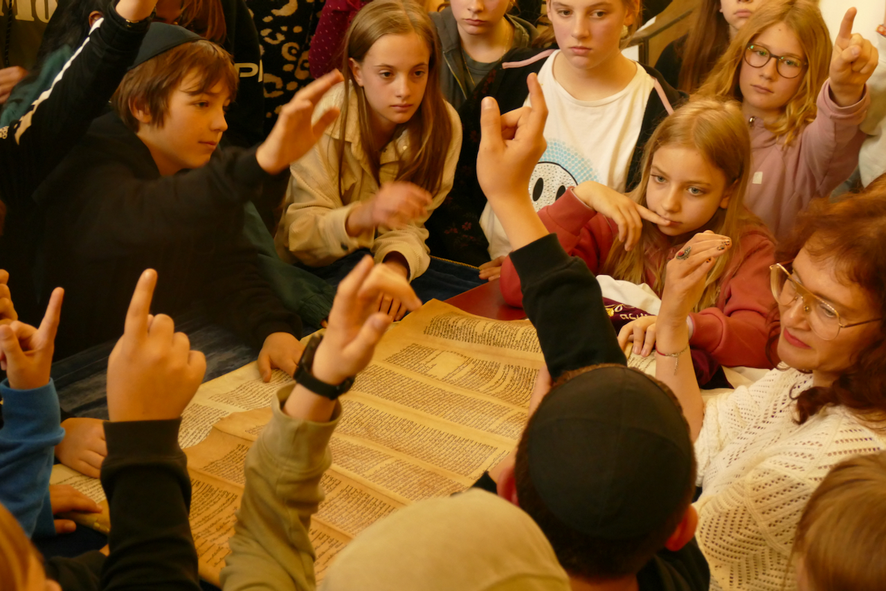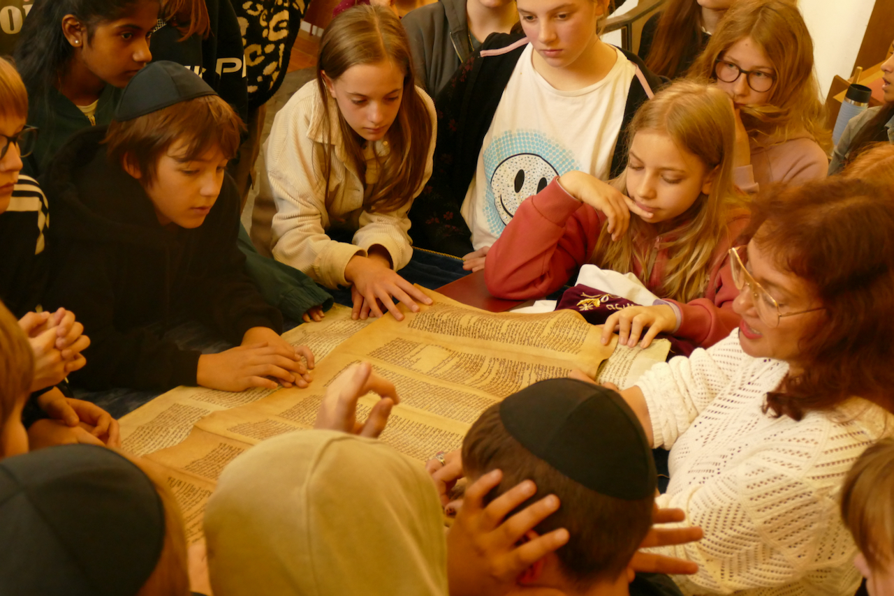 Die Sechstklässler hatten in ihren Religionsunterrichten bzw. in Praktischer Philosophie das Judentum genauer unter die Lupe genommen und erhielten nun die Gelegenheit zu echter Tuchfühlung. Und tatsächlich war die Zeit vor Ort intensiv gefüllt mit zahllosen Fragen und Ideen, wurden die Themen des Unterrichts ganz konkret und anschaulich. Warum sind Schüler gehalten, im Gebetsraum eine Kopfbedeckung zu tragen? Wie sieht eine Torarolle „in echt“ aus? Aber auch: Warum wird die Synagoge durch zwei Streifenwagen geschützt?