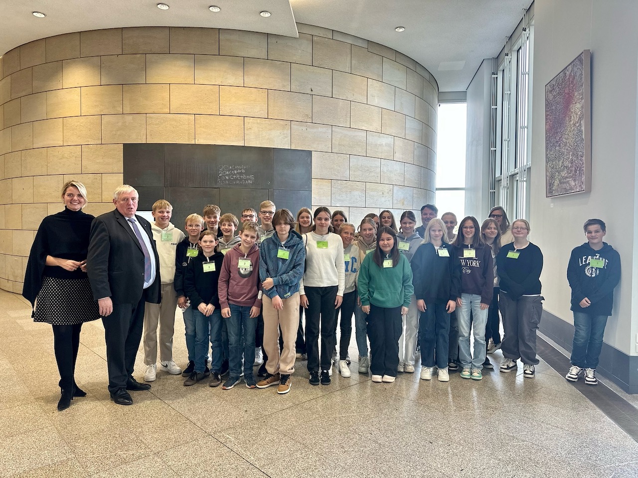 Wir, die Klasse 8a des Martinums, besuchten am 18.10.2023 den Landtag in Düsseldorf mit unserem Politiklehrer Herrn Friedrich und unserer Schulsozialarbeiterin Frau Kofort. Schon um 7 Uhr trafen wir uns am Bahnhof Emsdetten, um nach Düsseldorf zu gelangen. In Düsseldorf angekommen fuhren wir mit der Straßenbahn direkt zum Landtag und wurden dort herzlich begrüßt.