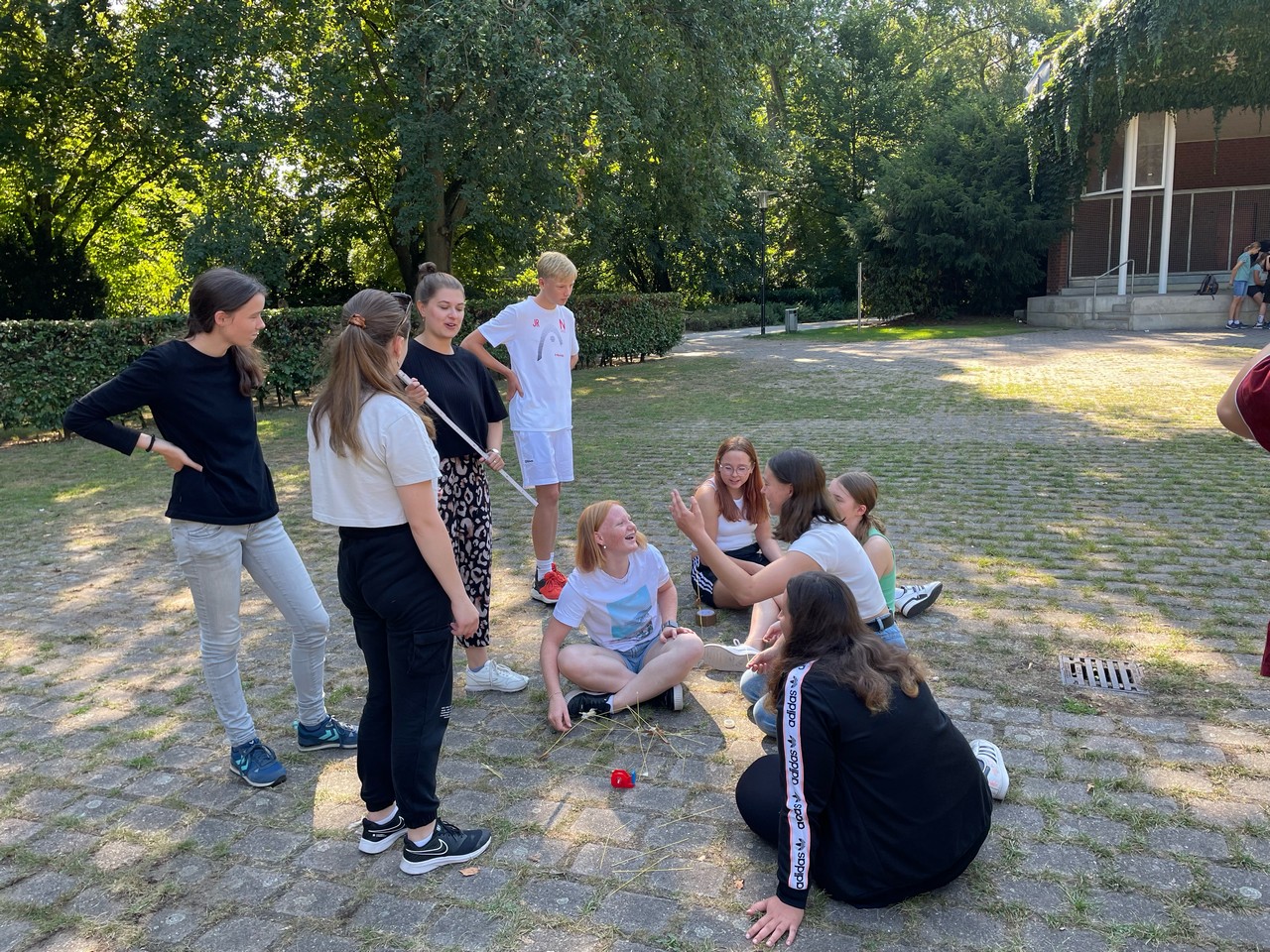Die Zusammenarbeit in der neuen Jahrgangsstufe stand am Dienstag im Fokus. In zufällig gelosten Gruppen mussten sich die Schülerinnen und Schüler bei Hof Deitmar verschiedenste Aufgaben stellen: Wikinger-Schach, das Malen der Stufenleitung, der Bau eines Spaghettiturms, Scharade oder Tischtennisfußball sind Beispiele für insgesamt 10 Stationen der EF-Olympiade. Ziel des Tages war es, in den Teams zusammenarbeiten, die eigenen Stärken und die der Mitschülerinnen und -schüler zu erfahren sowie die Jahrgangsstufe und die Stufenleitung besser kennenzulernen.