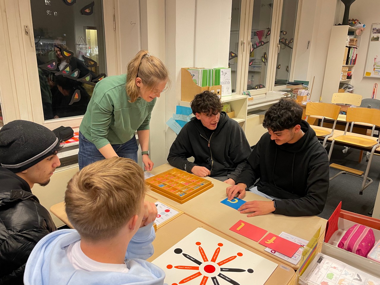 In der dritten Stufe befinden sich die Schüler:innen der 7. bis 9.Klasse und auch hier durften wir in einem Klassenraum schnuppern und uns einen Überblick über die Lernmethode von Montessori in diesem Alter verschaffen.