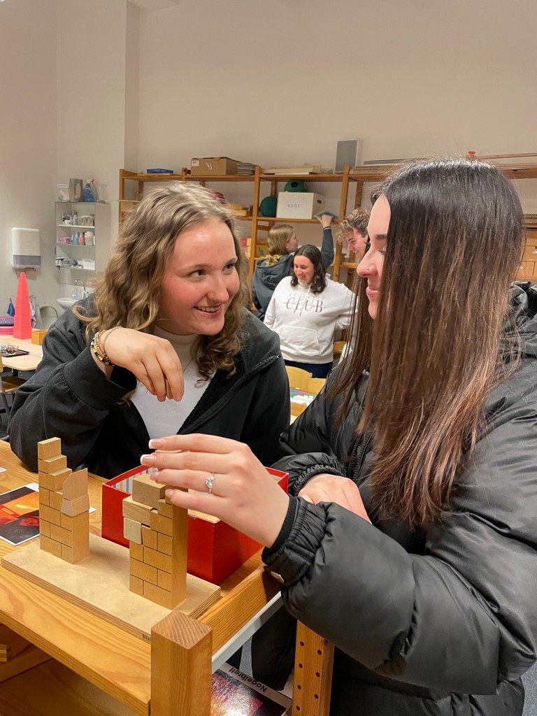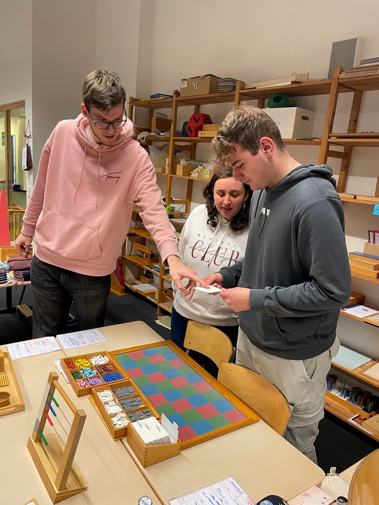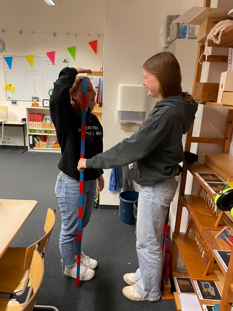 Angefangen in der ersten Stufe, in der Kinder von der 1. bis zu der 3. Klasse zusammen lernen, konnten wir das vorhandene Entwicklungsmaterial nicht nur anschauen, sondern durften selber versuchen, uns wie die Kinder in dem Alter mithilfe des Materials mit Inhalten aus beispielsweise Deutsch und Mathematik auseinanderzusetzen.