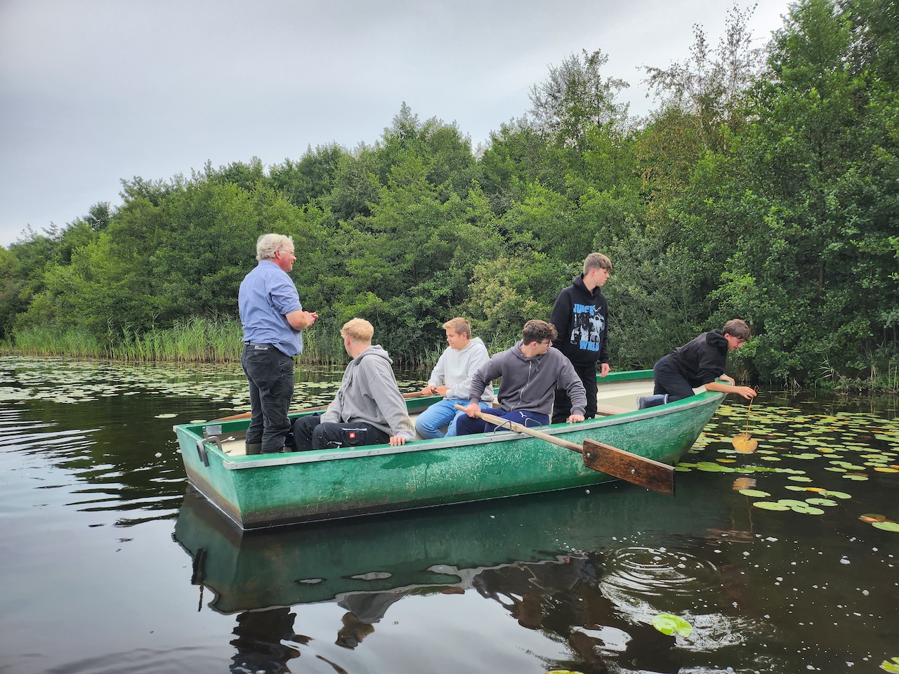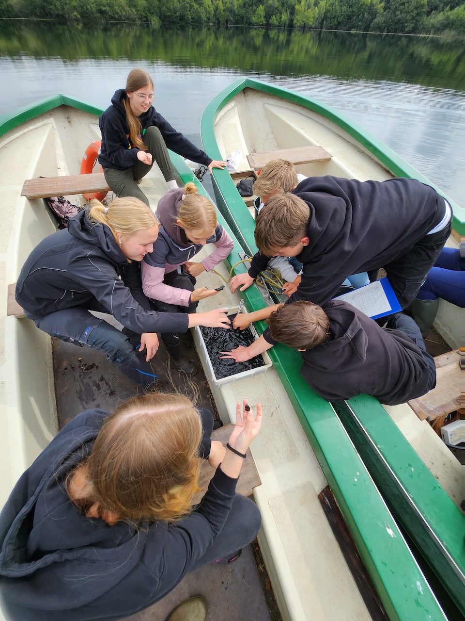 Höhepunkt der Exkursion war aber sicherlich die Bootstour auf das Große Heilige Meer. Hier wurden zahlreiche Gewässerproben entnommen, analysiert und von den Schüler*innen im Hinblick auf die qualitative Einordnung des Gewässers mit Hilfe der Referenten und des LK Lehrers Herrn Timmermann ausgewertet.