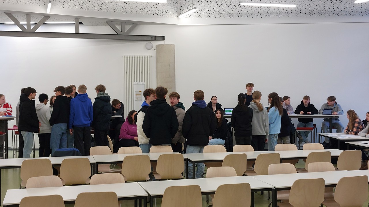 Die Schüler:innen aller 10er Klassen des Martinums hatten am letzten Donnerstag in der Mensa die Möglichkeit, sich über die Fächer der gymnasialen Oberstufe zu informieren. Dafür standen an kleinen Info-Ständen jeweils 2 - 4 Oberstufenschüler:innen der Stufe Q1 bereit, um ihre Fragen zu beantworten und Materialien zu den unterschiedlichen Fächern zu präsentieren.