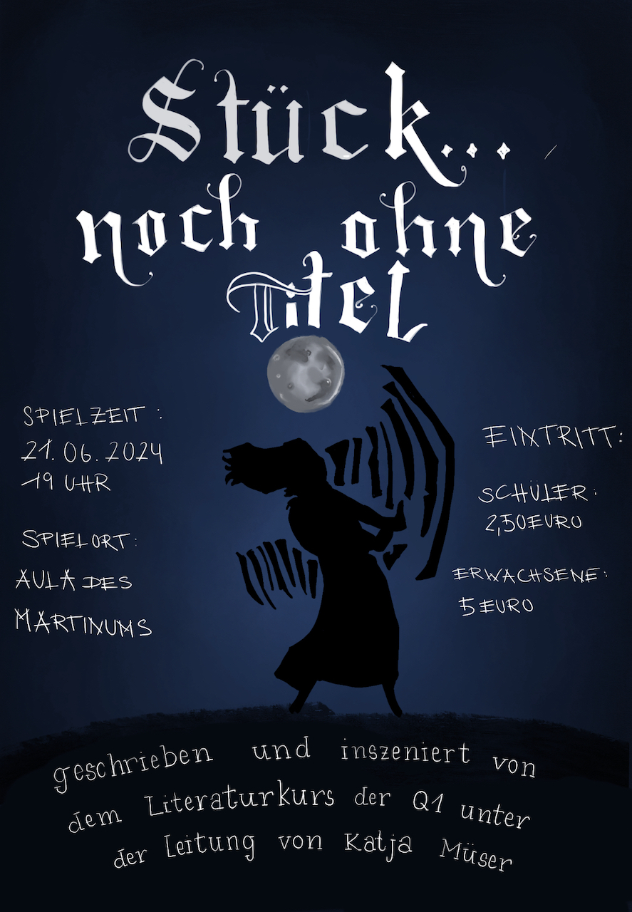 Am 21.6.2024 führt der Literaturkurs der Q1 unter der Leitung von Frau Müser sein "Stück ... noch ohne Titel" auf und freut sich über viele Besucher.